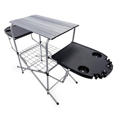 prep This Outdoor BBQ table features a portable carrying bag, a large top surface, two side tables and a lower shelf ideal for storing supplies and condiments Hassle-free one-Piece design makes this Grill stand unfold In seconds, no tools required for set up